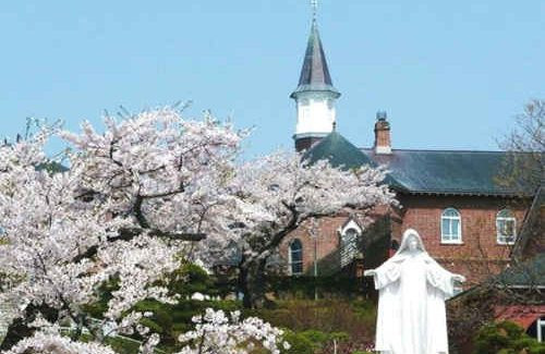 春になると、修道院の境内では美しい桜が開花します。一般的なソメイヨシノよりも、やや濃い色合いの花びらが特徴で、赤褐色のレンガ造りの建物と、純白のマリア像、そして鮮やかなピンクの桜が織りなすコントラストは、言葉では言い表せないほどの感動を与えてくれます。